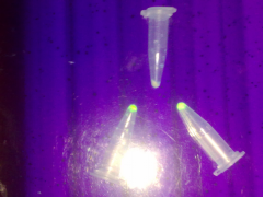 BL-21體內(nèi)成功表達(dá);而沒(méi)有經(jīng)IPTG誘導(dǎo)的菌體則不發(fā)出綠色熒光。