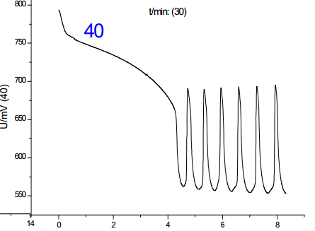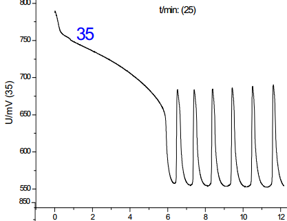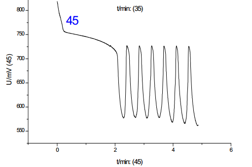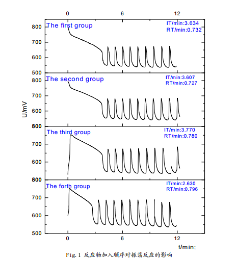 從圖中可以看出:在這四種情況下,體系均可以產生化學振蕩,但是誘導時間和振蕩周期略有差別。其中,第二組的體系振蕩周期**短,第四組的誘導周期**短。從理想的反應體系分析,振蕩的發生和振蕩周期應該與反應物質的加入順序基本無關,因而基本相同,加入順序主要會影響到反應的誘導時間,但從實驗結果看,雖然四組反應振蕩周期和誘導時間基本一致,但是又略有差別,忽略反應偶然因素分析認為: