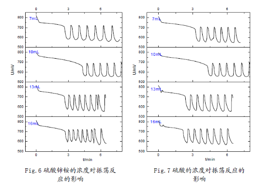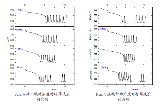 (3) 觀察分析圖形可知:反應物的濃度不但影響了誘導時間和振蕩周期,同時還影響了振蕩的波形。濃度對振蕩體系的影響是比較顯著的;但濃度對振幅的影響卻不大,說明濃度對振蕩體系的各個參數的影響是有選擇性的。這也反映出化學振蕩體系本身的復雜性,及其極容易受反應環境的影響。