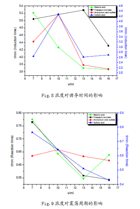 在40°C恒溫條件以及相同的加入順序下,分別改變丙二酸、溴酸鉀、濃硫酸、硫酸鈰銨的濃度(體積用量按7mL,10mL,13mL,16mL變化),考察誘導時間和振蕩周期的變化。