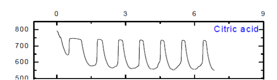 (1)  用0.45M丁二酸、0.45M乙二酸、0.45M檸檬酸代替丙二酸后,僅有蘋果酸、檸檬酸可以觀察到振蕩現象,乳酸沒有振蕩現象但是出現異常現象。