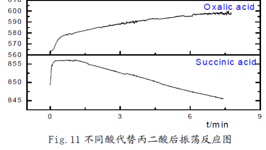 用0.45M丁二酸、0.45M乙二酸、0.45M檸檬酸代替丙二酸,用0.20M碘酸鉀、溴酸鈉代替溴酸鉀,用硫酸錳、硫酸鐵溶液代替硫酸鈰銨,分別進行實驗,觀察是否發生振蕩