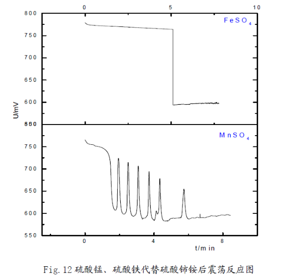 3)  用硫酸錳代替硫酸鈰銨后,可以看到振蕩現象,但是用硫酸鐵代替硫酸鈰銨,振蕩反應沒有發生,但是查閱資料知:Mn2+、Fe3+同樣具有催化作用。在振蕩體系中,錳元素存在Mn2+、Mn3+兩種形式,鐵元素以Fe2+、Fe3+的形式存在。