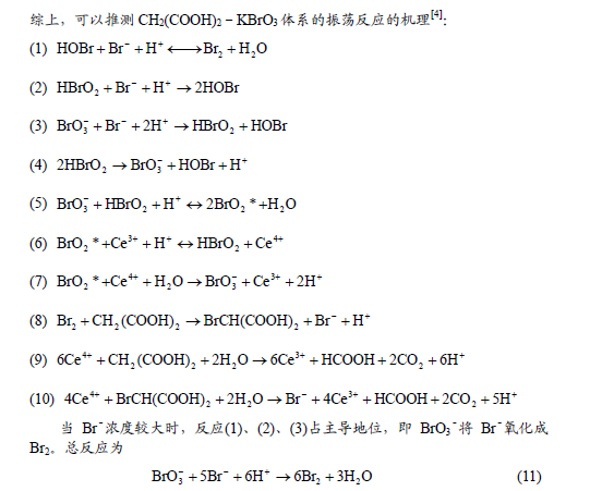 在上述10個反應中,HBrO2具有自催化的特點,起著切換振蕩過程的開關作用。