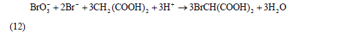 此時,濃度較大的Br2與丙二酸反應生成BrCH(COOH)2,即反應(8)。反應(8)與反應(11)構成了Br-與Br2的循環,其總體的宏觀效果(簡稱過程A)可表示為: