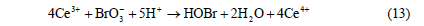 當Br-濃度較小時,占主導地位的反應為Ce3+被BrO3-氧化成Ce4+,即由反應(4)、(5)、(6)合成的第二個宏觀反應(簡稱過程B):