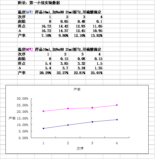 ① 稱取葡萄糖90.0g,配成葡萄糖含量為18%的葡萄糖溶液500ml;稱取NaBr13.0g,配成含NaBr2.6%的溶液 ② 溫度60℃,其它同前一次實(shí)驗(yàn) ③ 同前一次實(shí)驗(yàn) 分別于11:15、12:15 、13:15、 14:15各取反應(yīng)液10ml 于錐形瓶中,各加入NaOH25ml,搖勻,用硫酸滴定 |